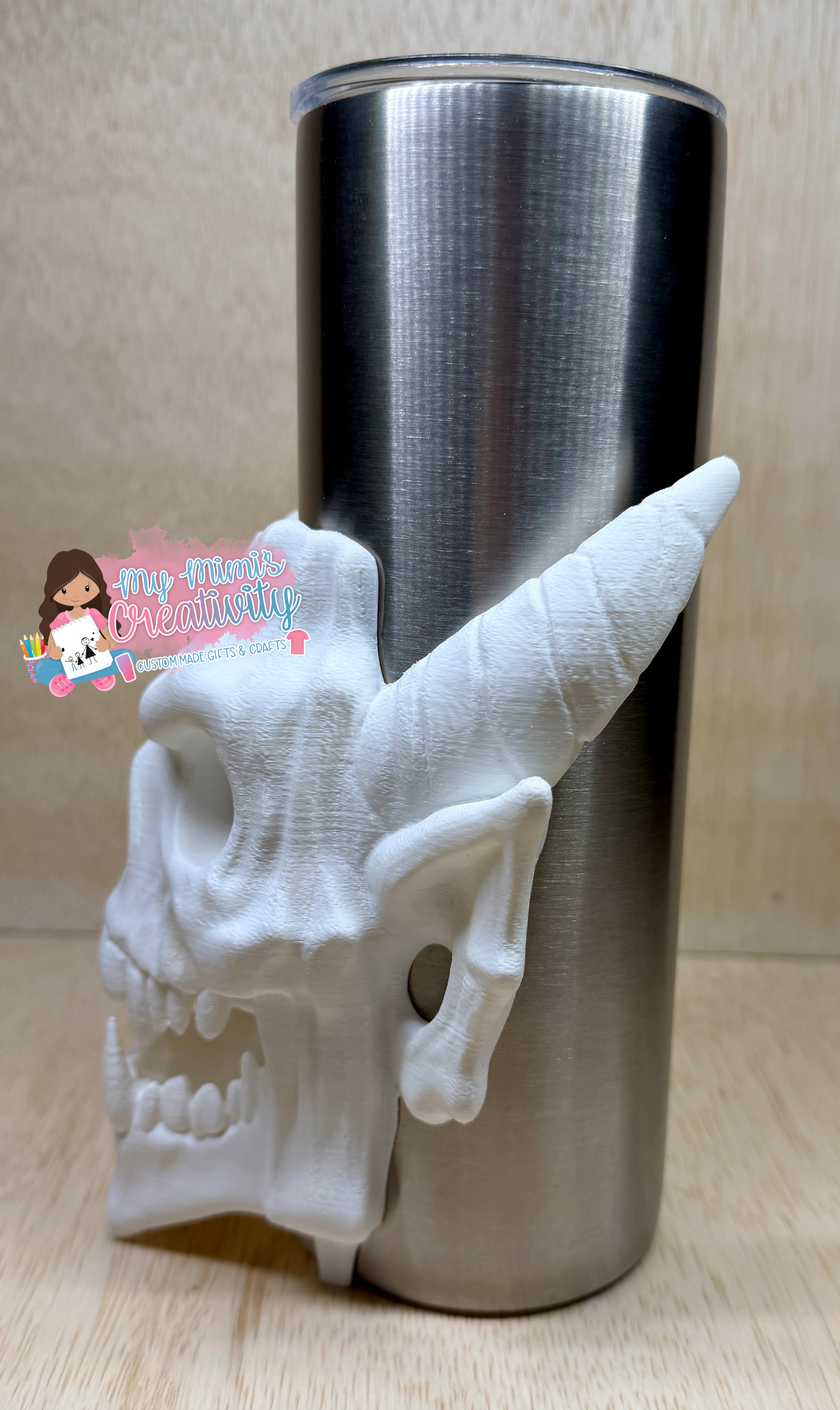 Turn your everyday drink into a statement piece with this 3D Skull Tumbler Half Sleeve. Featuring a highly detailed horned skull design with sharp fangs and dramatic sculpted features, this piece brings dark fantasy energy to your tumbler.